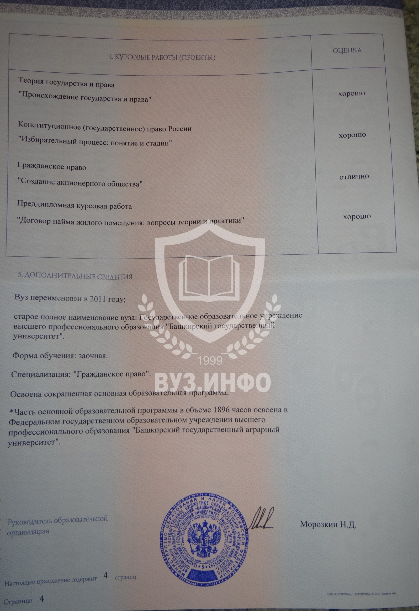 Для начала диплом Башкирского государственного университета на бланке Гознак — Кострома 2014 года окончания (степень обучения Специалитет).